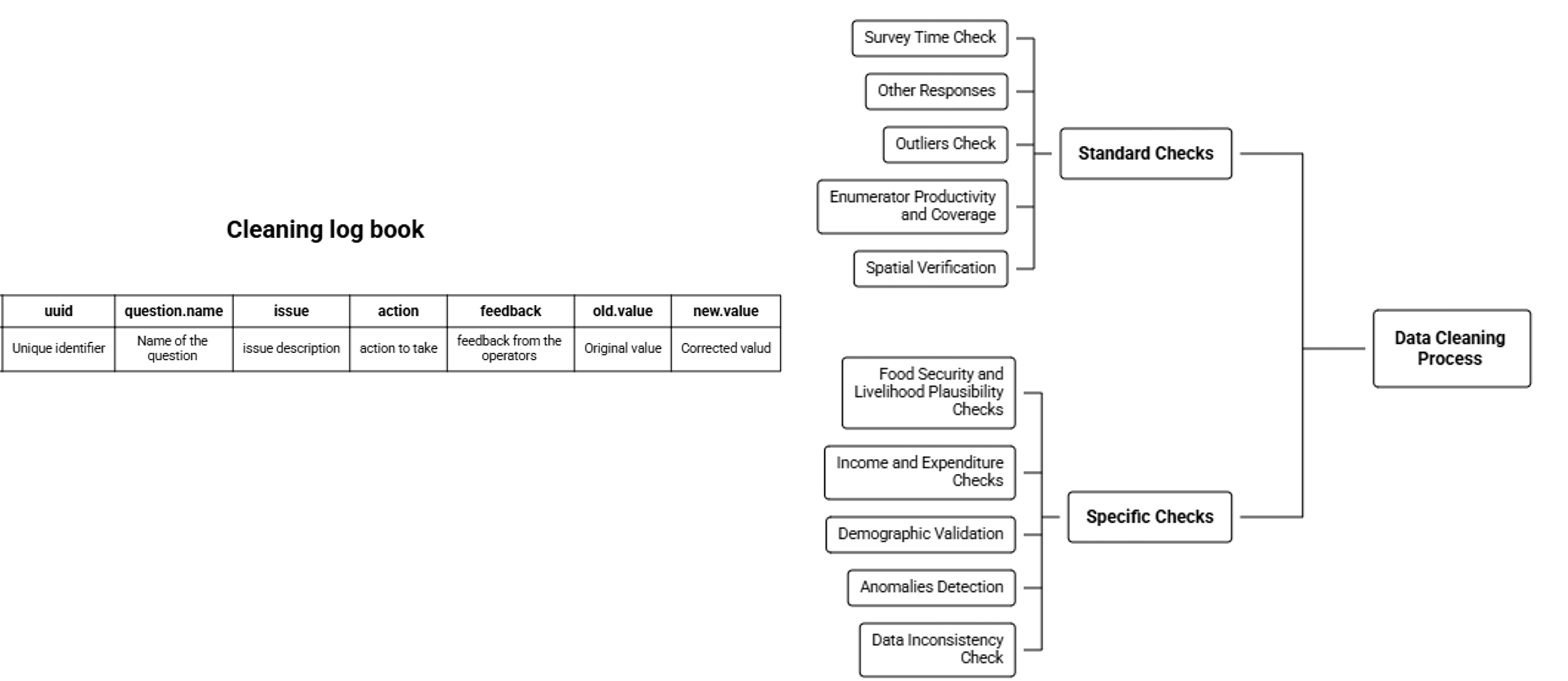 Data cleaning is the process of identifying and correcting errors and inconsistencies in raw data to improve data quality 1. in the humanitarian context identifying data errors will be categorized into two steps. standard checks and specific checks. depending on the scope of data collection points, all data should pass under the standard checks. while specific checks will depend on the availability of indicators and data collection points.